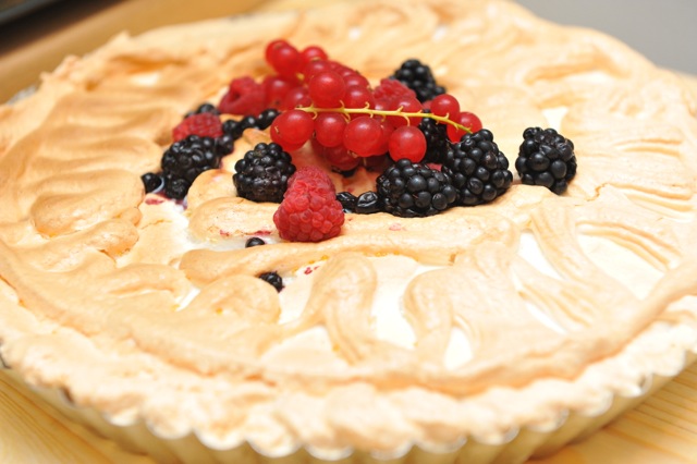 Peste blatul de tarta adaugati crema de lamaie si bezeaua, intre straturi puteti sa puneti fructe de padure (efect visual ridicat cand taiati o portie).